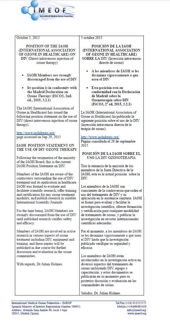 POSICIÓN DE LA IAOH (International Association of Ozono in Healthcare) SOBRE LA DIV (Inyección intravenosa directa de ozono)